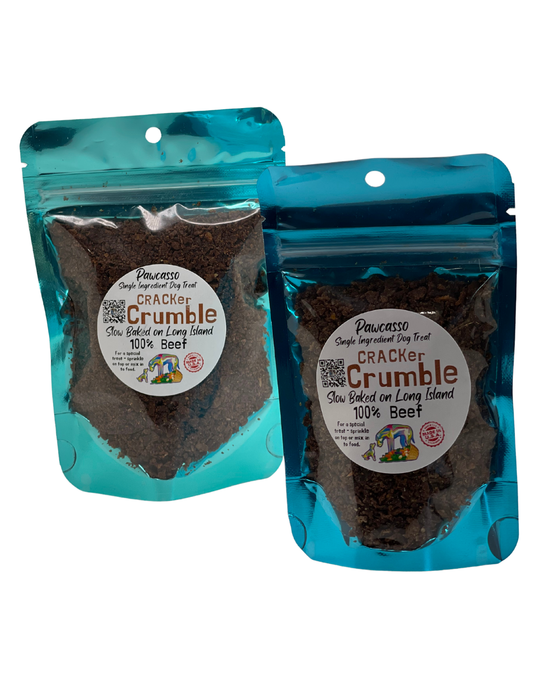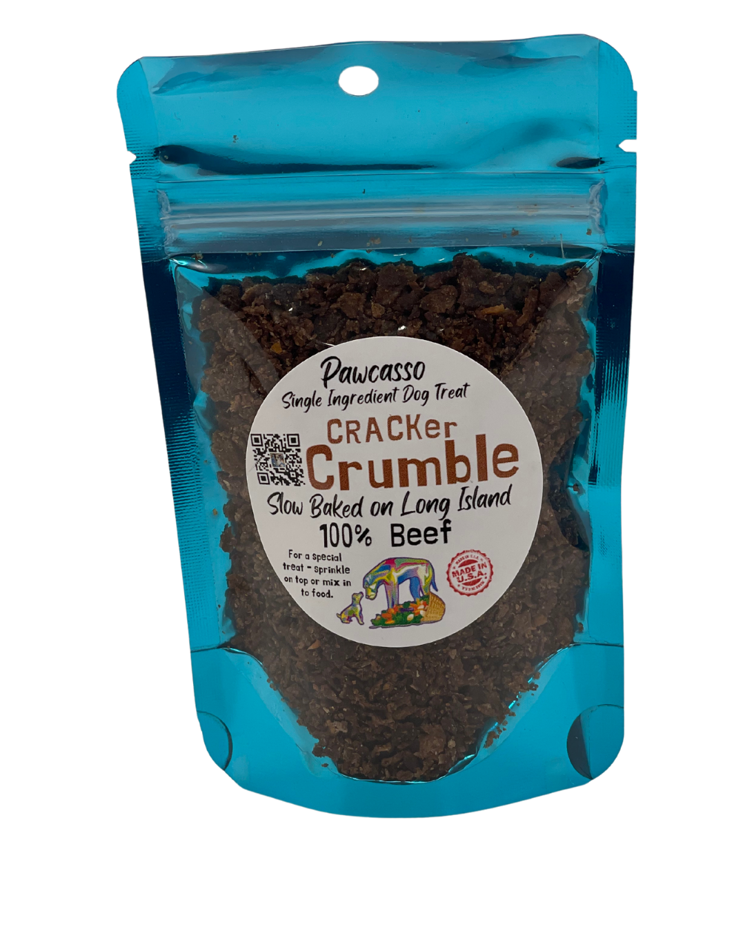 Unleash the bold essence of top round beef with our Beef Cracker Crumble. Sourced from the finest cuts, each crumble is a celebration of meaty goodness, adding depth and richness to your pup's meals.